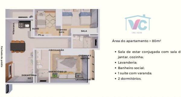 Apartamento novo com 03 quartos, sendo 01 com suíte, sala para 02 ambientes, banheiro social, cozinha, área de serviços e 02 vagas de garagem.